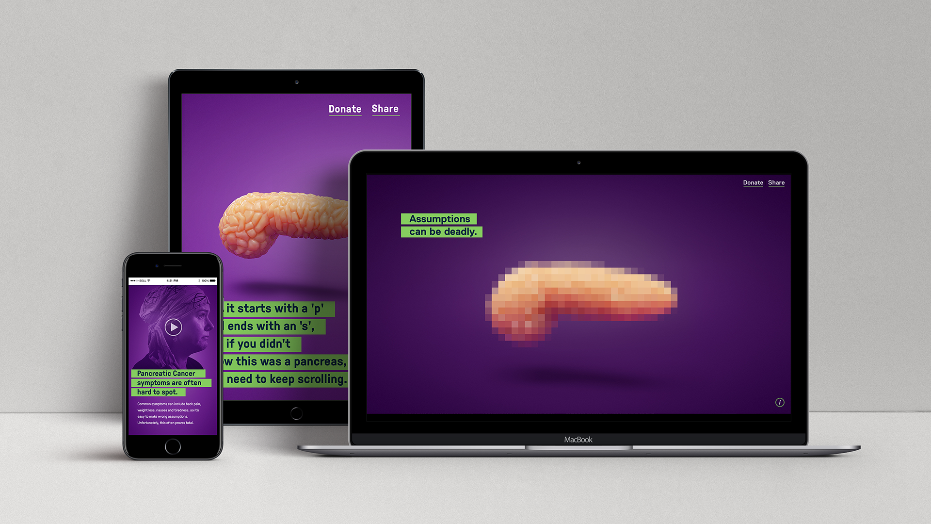 The pancreas is the organ that nobody talks about. It's shape also resembles another organ we don't talk about in polite society – and that was our 'in'. We created an unapologetic misdirect campaign to command attention, and once we had it, educate on the severity of the disease. Our pancreas visual was served up on YouTube and social media, OOH, and print. All pushing to a campaign site where you could dive deeper into other assumptions people make about the disease, and see the human stories behind this deadly disease.